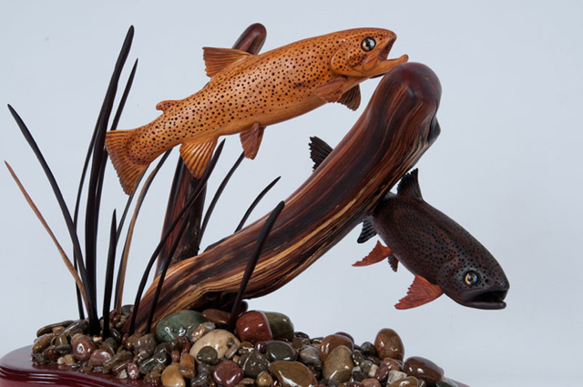 [dropcap]T[/dropcap]om Dean is a completely self-taught artist from Great Falls, Montana. His custom one-of-a-kind wood carving sculptures have sold to private owners, corporations and collectors across the United States and Canada. Tom has taken his 40 year passion of fly fishing in Montana and has turned that into another passion of his; hand carving native trout, dragon fly’s, cattails/reeds, frogs, other fish species and more recently full sized bison skulls out of exotic woods from around the world. Including woods from Africa, Australia, Brazil, Central America, Hawaii and elsewhere, setting them into their natural river environments.